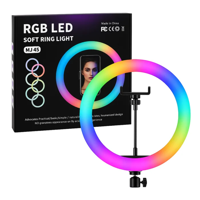 Bring your content to life with the MJ45 18-Inch RGB LED Ring Light. With vibrant RGB colors, adjustable white tones (2700K–6500K), and smooth brightness control, you can create the perfect lighting for any mood or style. The sturdy tripod (70–210 cm) and 360° phone holder give you total flexibility, while the touch panel and wireless remote make adjustments effortless. Ideal for YouTube, live streaming, makeup, and photography—this ring light makes every shot stand out.