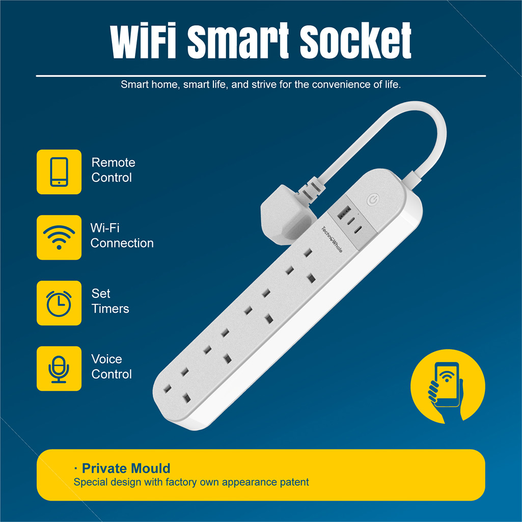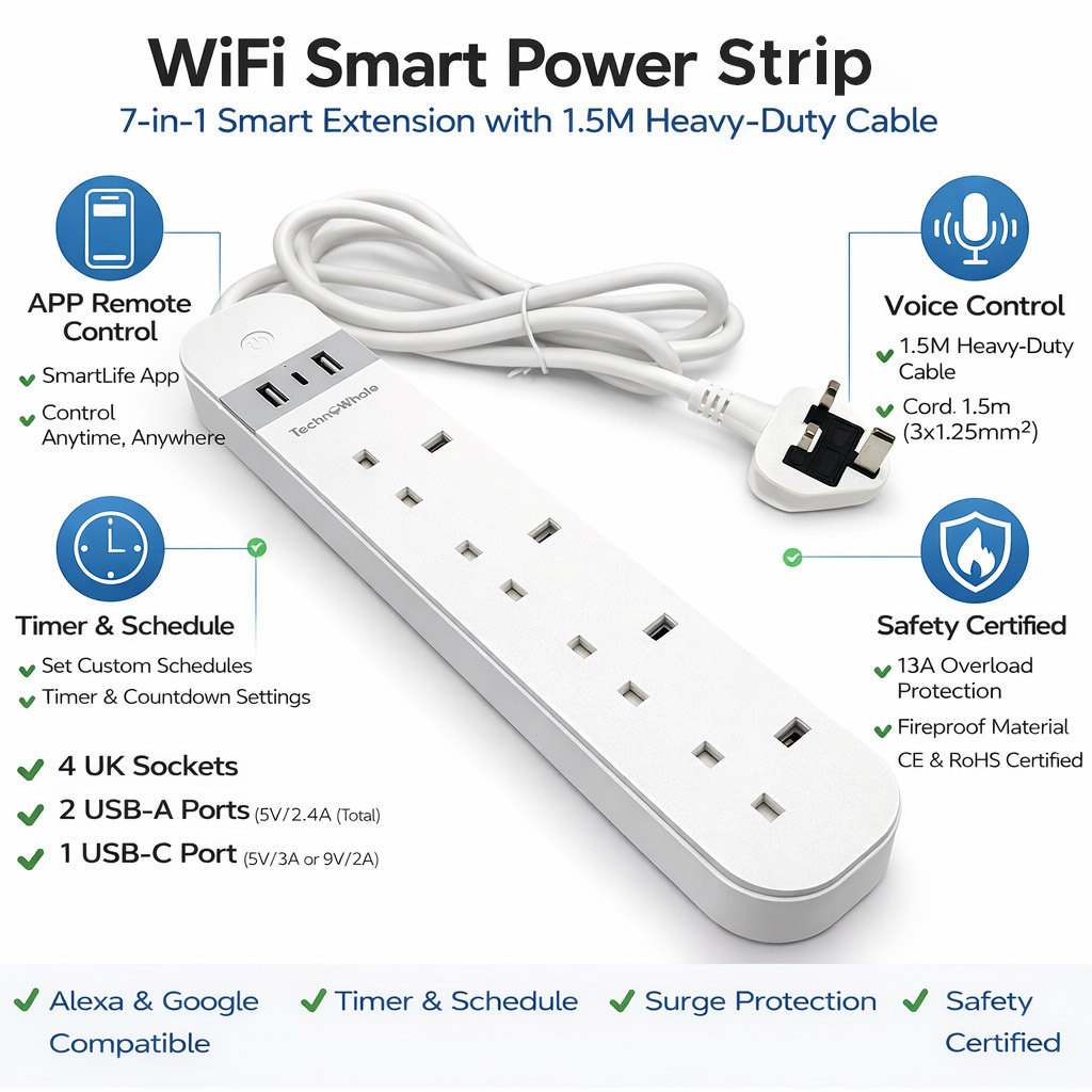 Upgrade your space with the Technowhale WiFi Smart Power Strip with 1.5M heavy-duty cable — a premium 7-in-1 smart extension lead built for modern smart homes and offices. Featuring four UK 3-pin sockets, two USB-A ports, and one USB-C fast charging port, this smart power strip allows you to power and charge multiple devices safely from a single hub.