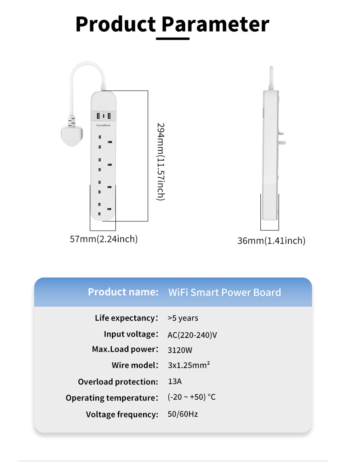 AC 220–240V | 50/60Hz | Operating Temperature: -20°C to +50°C | 1.5M heavy-duty cable | Designed for 5+ years lifespan.