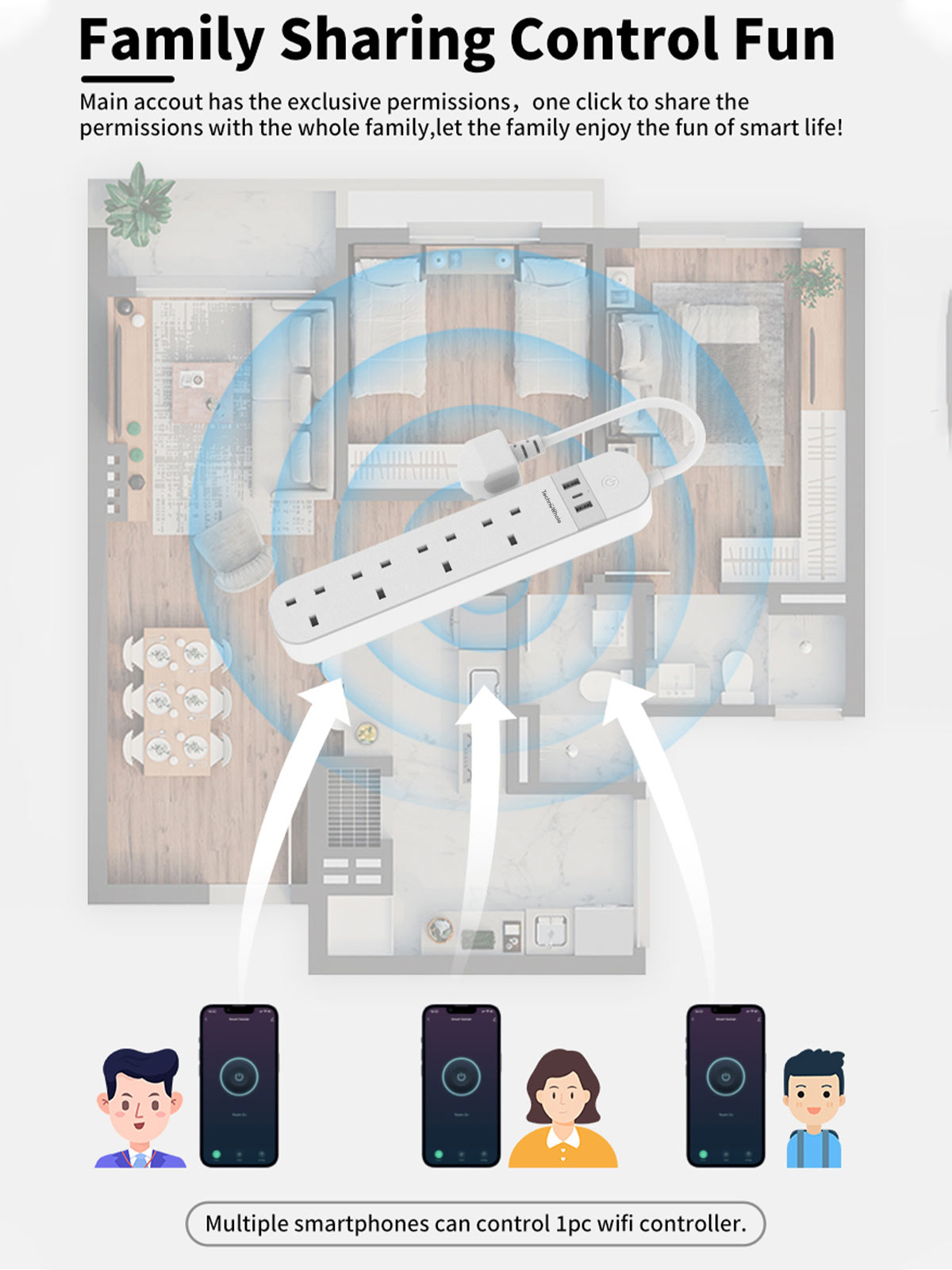 Main account can share device access with multiple family members. Multiple smartphones can control one smart power board simultaneously.